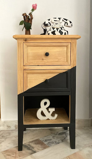 Fuera de nuestra zona de confort quedaba el trabajo que hoy mostramos... Las directrices que nos dio Marga estaban más o menos claras; decapar, tintar y pintar, para que su mesilla de noche hiciera juego con su nuevo cabecero.